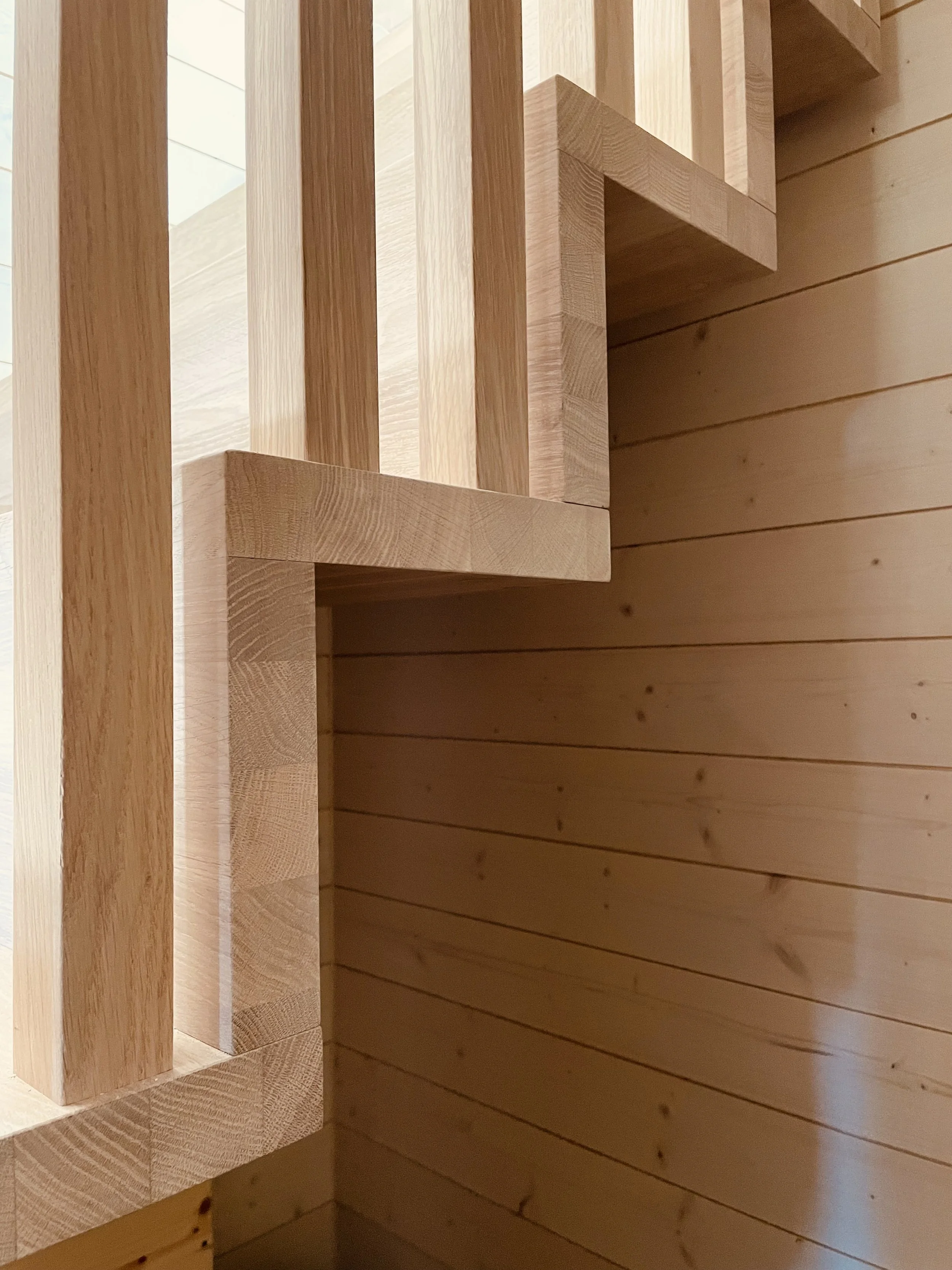 Konstruksjonen og fasadene er utført i tre, med store glassfelt mot sør som åpner hytta mot landskapet og lyset. Den utkragede delen er kledd i liggende panel, som med tiden vil patineres og gli naturlig inn i omgivelsene.